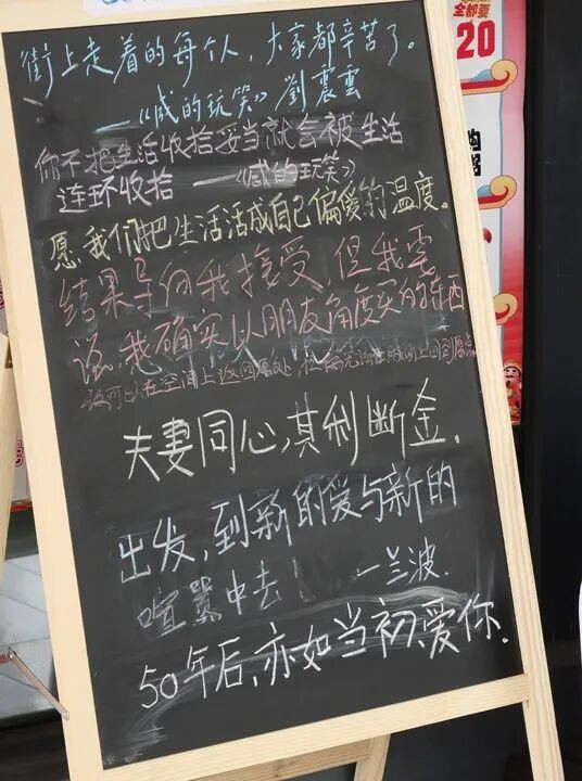 这何尝不是一剂情绪解药?现代生活里,悲欢常困于屏幕之后。而粉笔字有种奇妙的治愈力,它可触摸、可修改、可被随时轻轻擦去。也正是如此随时随地,随心所欲,书写本身成了疗愈过程,把无形情绪化为有形痕迹。写下烦恼,如同将重担轻轻卸下一角;读到共鸣,仿佛在人群中有人向你轻轻点头。这种无声的“共在”,疗愈了都市人被看见的渴望,抵过万千句空洞的安慰。